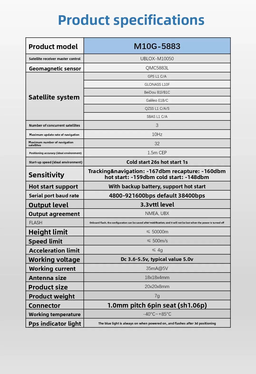 โมดูล M10G-5883GNSS ใช้ชิป M10 รุ่นล่าสุดของ Ublox ซึ่งมีประสิทธิภาพสูงและความเร็วในการค้นหาดาวที่เร็วกว่า สามารถรับสัญญาณดาวเทียมได้สูงสุด 32 ดวง และมีการระบุตำแหน่งที่แม่นยำ เซ็นเซอร์เข็มทิศแม่เหล็กโลกประสิทธิภาพสูง QMC5883L ในตัวมีขนาดเพียง 20 * 20 * 8 มม. มีขนาดเล็กและติดตั้งง่าย ใช้เสาอากาศนำเข้าประสิทธิภาพสูงและมีขนาดเล็ก ดีไซน์กะทัดรัด โดยไม่สูญเสียประสิทธิภาพ น้ำหนักเบาเพียง 7 กรัม เหมาะสำหรับยานเดินทางข้ามเวลาขนาดเล็ก/ยานวงกลม/ยานปีกคงที่น้ำหนักเบา